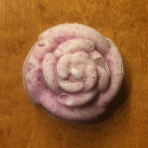 lein zeepje (~ 2cm) vind ik de mooiste. Eentje is helder blauw met lavendel uit oma`s tuin. Ruikt lekker, maar niet naar lavendel. In de witte zitten echte rozenblaadjes en in de gele heb ik citroenrasp gedaan.